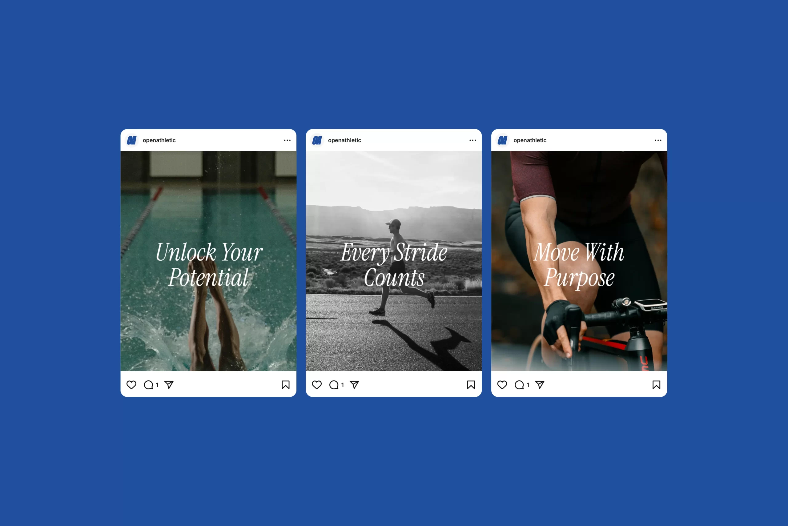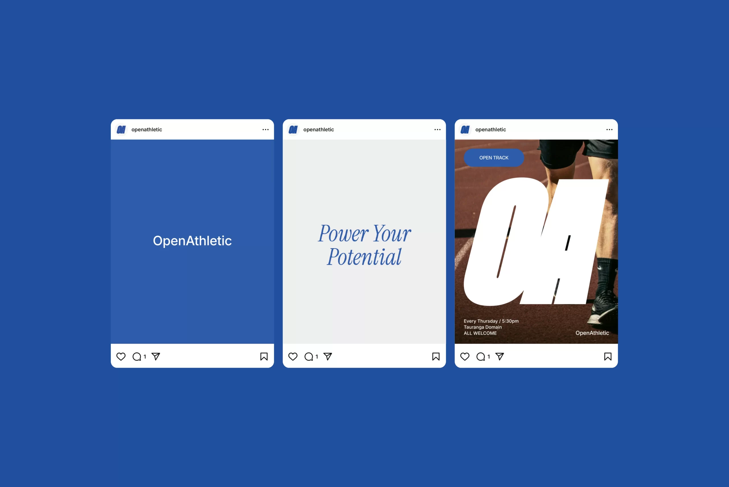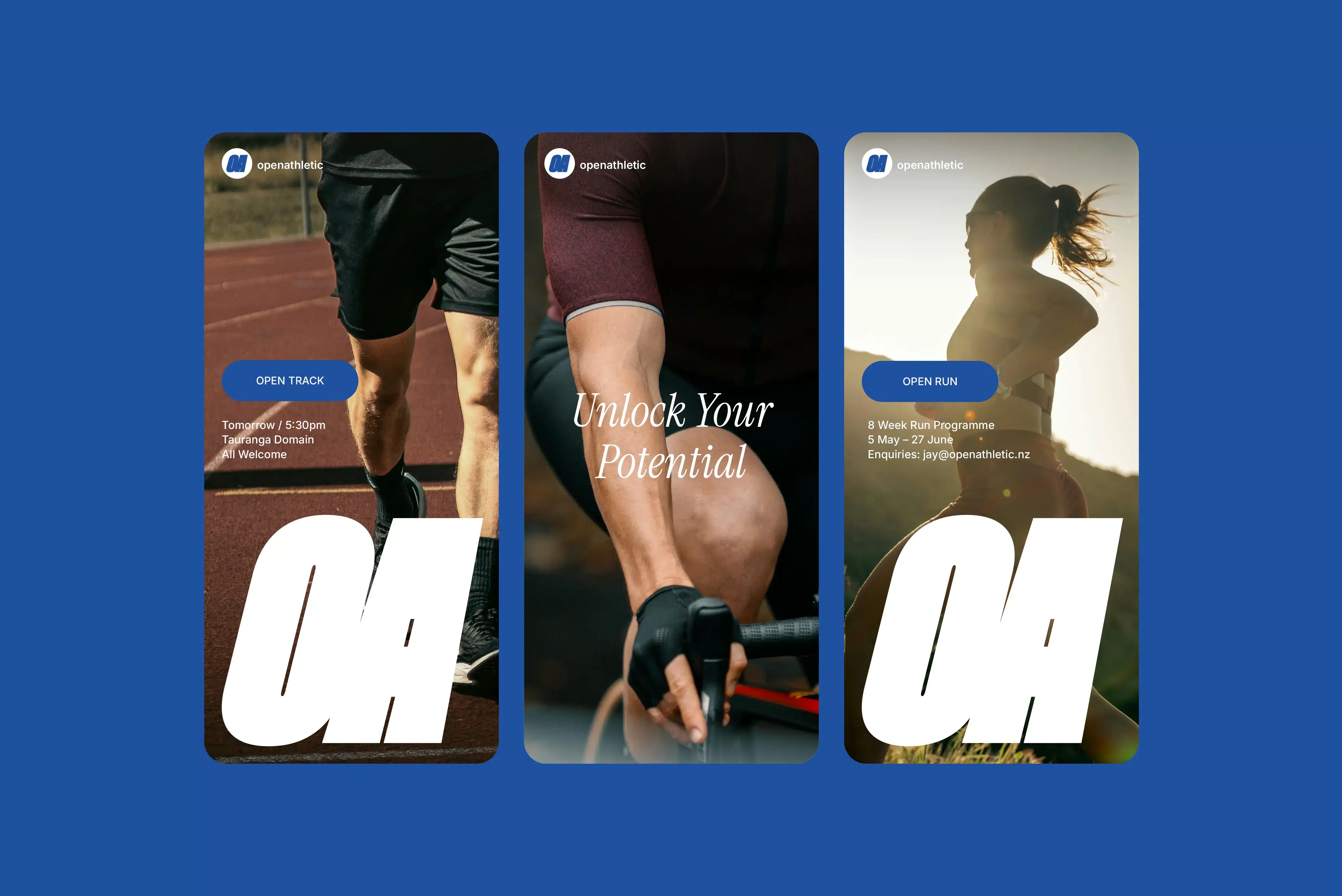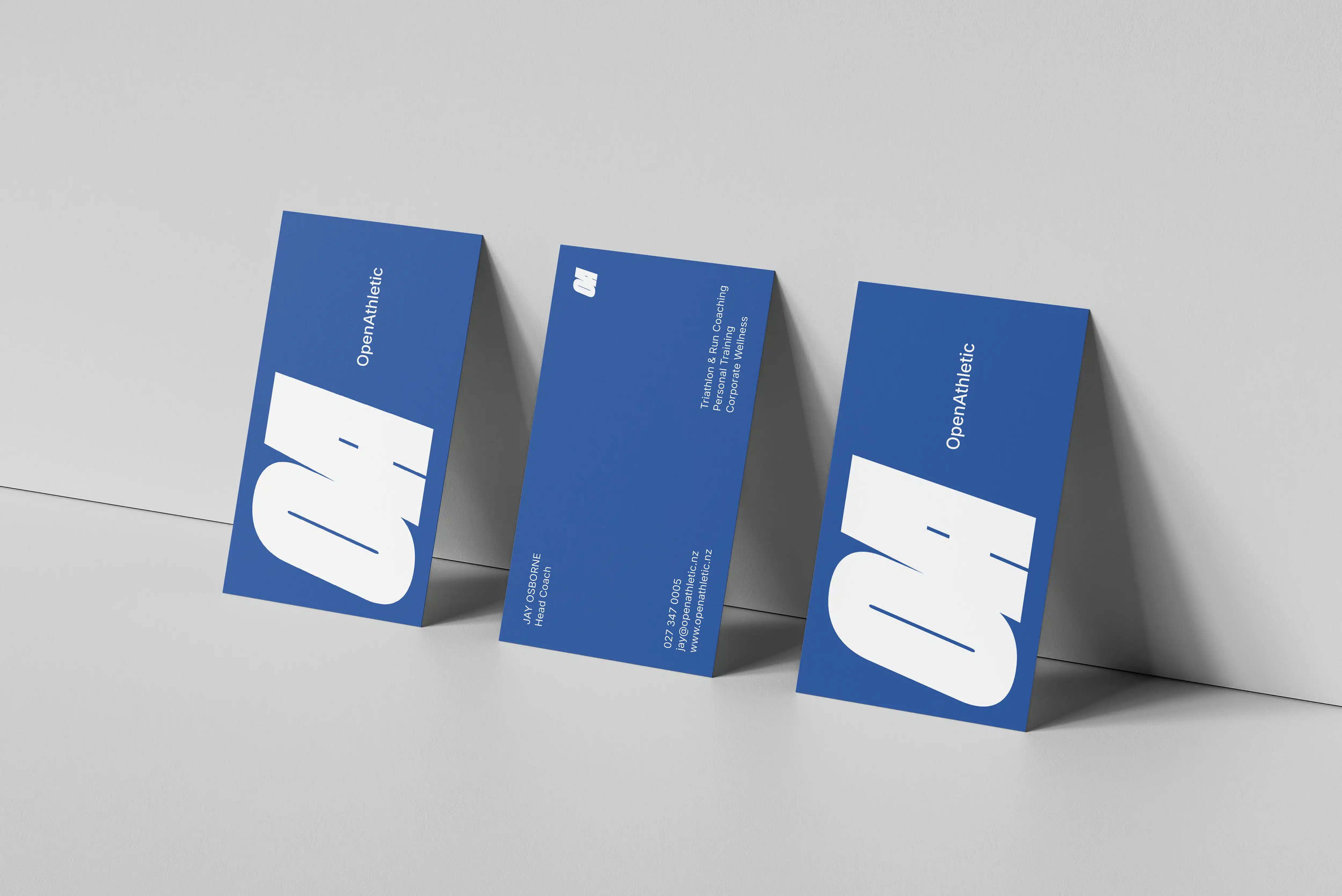 Open Athletic exists to support athletes at every level – not just the elite. The brand offers personalised coaching for endurance sports, one-on-one personal training, and corporate wellness programmes. The identity blends nostalgic nods to classic 90s sports branding with a clean, modern execution. A bold logotype, dynamic emblem, and a distinctive azure blue bring energy and movement to the brand, while maintaining a sense of approachability.